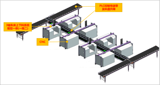 華成工控自動化機床加工車間解決方案,通過驅控一體電控箱控制機床上下料機械手及料盤,并與控制傳輸帶的PLC結合,打造出了一個易部署、易維護、高可靠性,可24小時作業的自動化取放料產線。