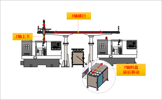 方案采用一拖二的架構,即一個機械手負責兩個機床的取放料。對此,華成工控提供EC-L3三軸驅控一體控制系統,其中X伺服軸控制機械臂左右橫行,Z伺服軸控制機械臂上下運動,Y伺服軸則控制料盤的前后移動。