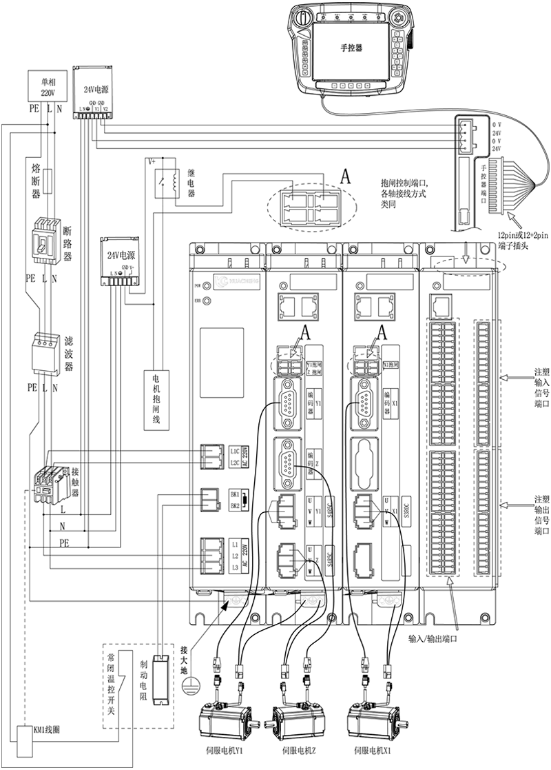 三軸注塑驅控一體化機械手控制系統-EC-S3,箱體整體外觀接線說明: