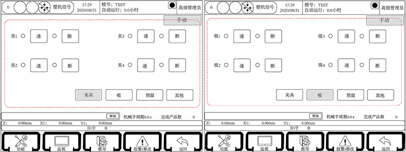 機械手系統型號為QC-S3G,權限切換到高級管理員身份,首先撥到手動狀態下,治具頁面設置,點擊觸摸屏右下角的按鈕“夾具”和“吸”按鈕分別進入治具的手動操作頁面,如下圖: