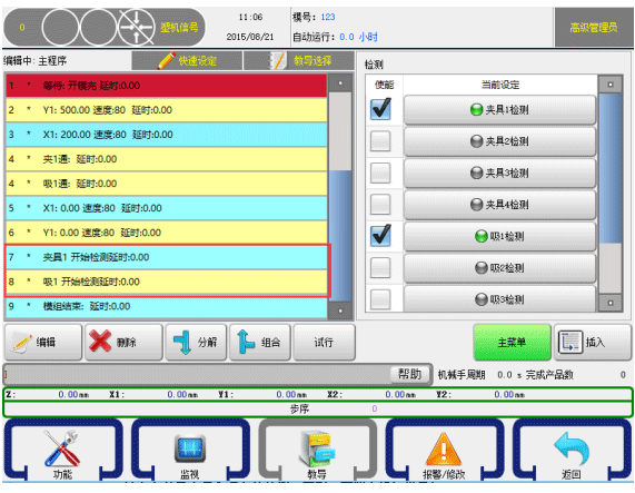 點擊【檢測】按鈕可進入吸盤、夾具檢測動作的教導頁面,教導夾具和吸盤 的動作后,點擊需要檢測確認信號的程序步后,再點擊對應的夾具和吸盤檢測動作按鈕,使其指示燈變成綠色,再點擊左邊的框框打上“√”,再點擊【插入】按鈕將該檢測程序插入到所選擇程序步的前面,程序從此步開始檢測夾具和吸盤的確認信號。