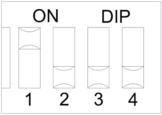 例如:二進(jìn)制0001中最低位即個(gè)位數(shù)為1對(duì)應(yīng)撥碼開關(guān)中“1”的開關(guān),十位數(shù)0對(duì)應(yīng)撥碼開關(guān)中“2”的開關(guān),千位數(shù)0對(duì)應(yīng)撥碼開關(guān)中“3”的開關(guān),萬位數(shù)0對(duì)應(yīng)撥碼開關(guān)中“4”的開關(guān),則撥碼開關(guān)中“1”對(duì)應(yīng)的開關(guān)應(yīng)撥到“ON DIP”一頭,撥碼開關(guān)中的“2”“3”“4”對(duì)應(yīng)的開關(guān)都撥到“1234”一頭,二進(jìn)制0001的撥法如下圖: