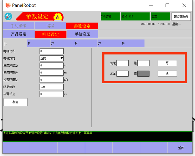 1、先進(jìn)行權(quán)限登錄,然后把手控器的狀態(tài)切換為停止?fàn)顟B(tài),然后找到參數(shù)設(shè)定中的機(jī)器設(shè)定中的伺服參數(shù);
