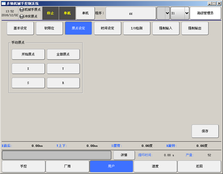 手動狀態下按下急停按鈕斷掉伺服使能,手動移動各軸至原點位置然后再進入原點設定頁面下先點擊【開始原點】按鈕再點【設為原點】按鈕,待各軸坐標都顯示為0后原點設置成功。