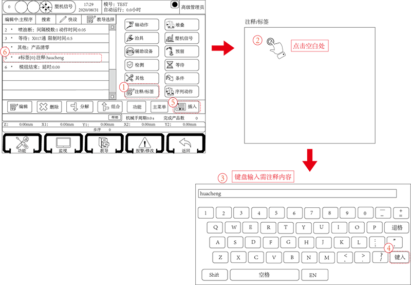 點擊“注釋/標簽”按鈕可進入注釋/標簽的教導頁面,插入了注釋后,可以對上一步程序或者下一步程序進行說明;同時在執行子程序跳轉時必須先要插入“注釋/標簽”才可將條件插入進主程序中。(如果使用條件必須插入“注釋/標簽”)