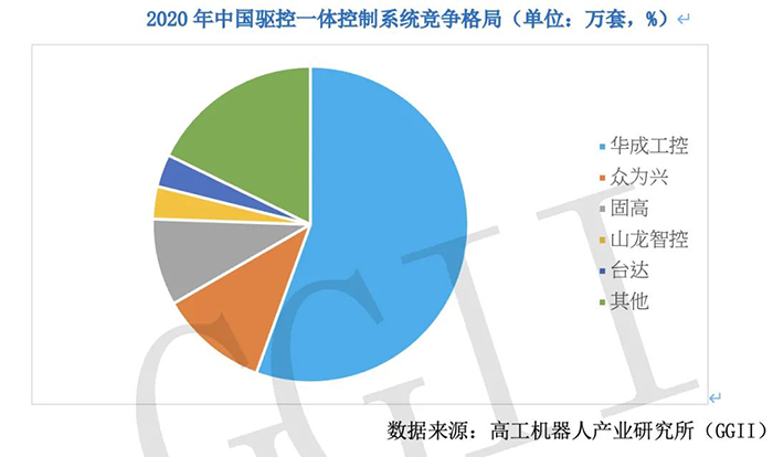 從具體的廠商來看,目前國內驅控一體領域的機械手控制系統玩家主要有華成工控、眾為興、固高、山龍智控、臺達、納博特等廠商,其中華成工控在目前國內驅控一體市場的占有率超過50%,形成了絕對優勢。